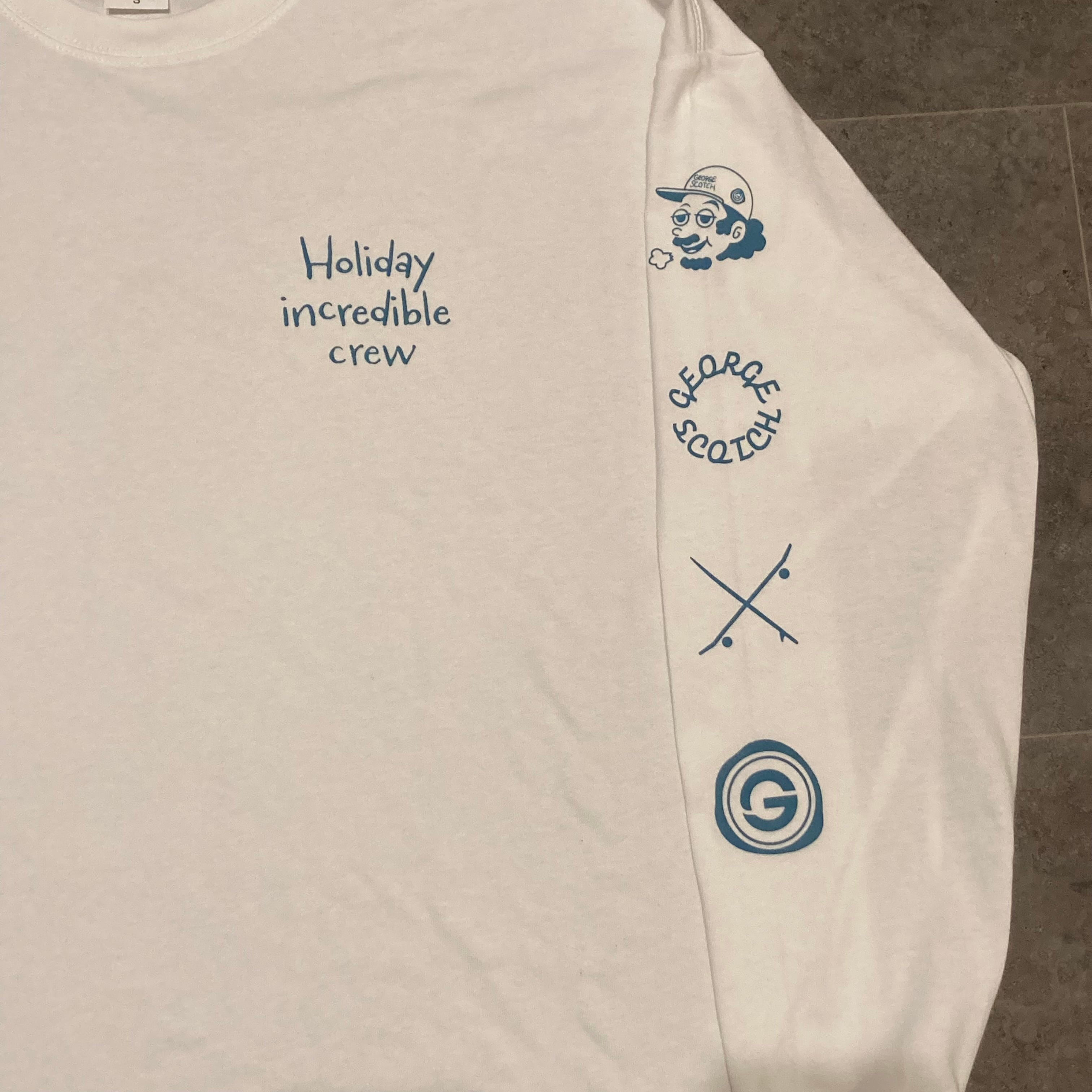 腕にはいろんな形のGEORGE SCOTCHロゴを並べ、